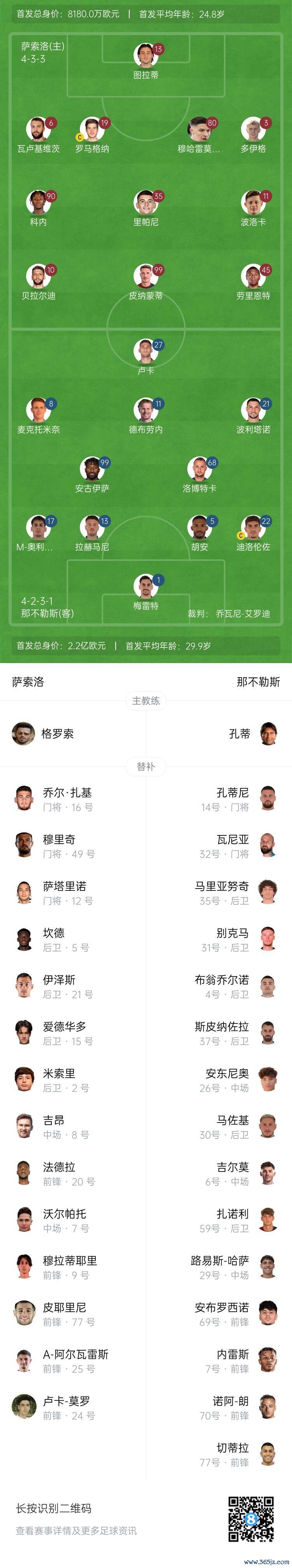 8月24日讯 00:30意甲职业联赛 第一轮,那不勒斯客场应战 对阵萨索洛。赛前, 中超足球直播双方公布了本场赛事 的杆位阵形 。
