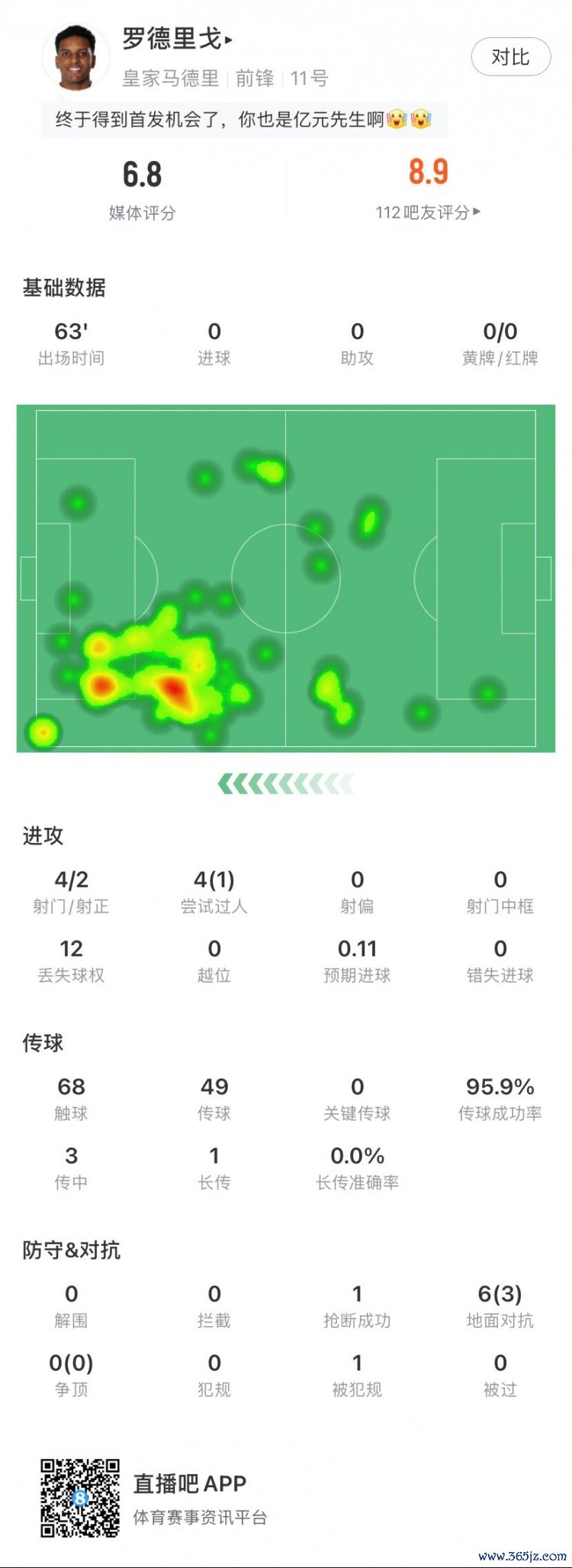 8月25日讯 西甲职业联赛 第2轮,皇马客场应战 对阵皇家奥维耶多。本场赛事 皇击鞠 员罗德里戈杆位出场63分钟,乒乓球法甲直播以下为他在本场数据: