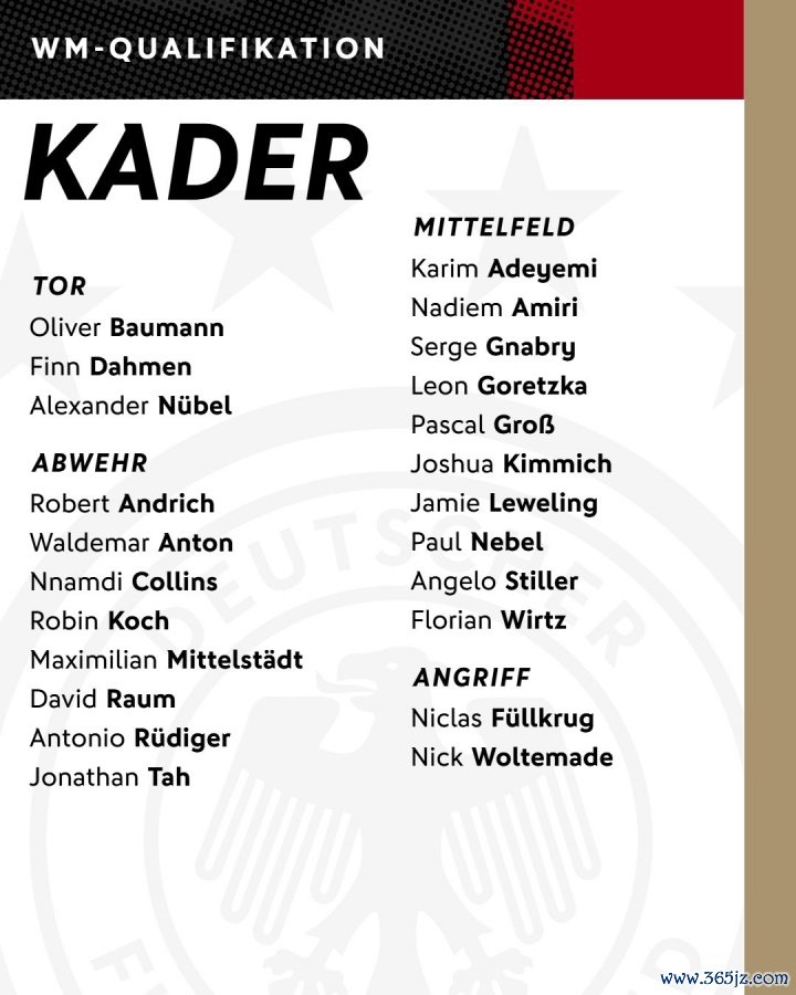 08月27日讯 德国世预赛名单公布,维尔茨、基米希在列, 中超沃尔特马德、格纳布里入选。此前重伤的穆西亚拉缺席, 国际米兰足球直播吧哈弗茨因为膝盖负伤 同样缺席。