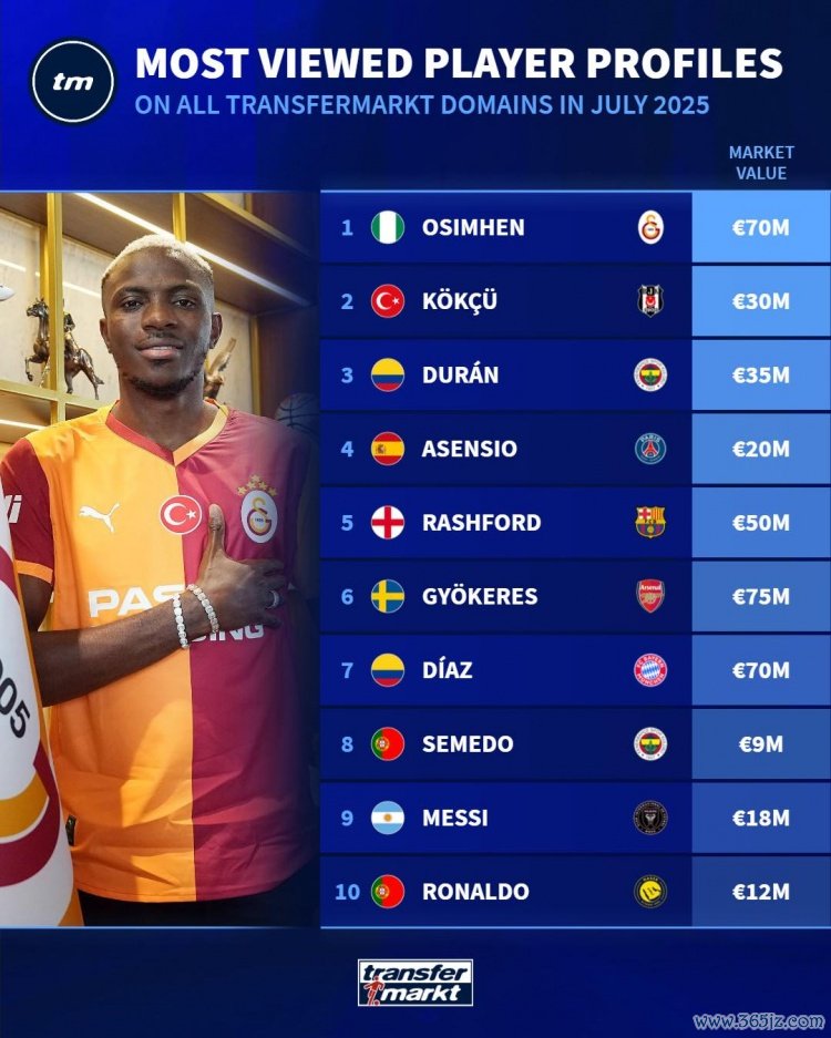 7月德转球员页面浏览量榜:奥斯梅恩居首,拉什福德、迪亚斯上榜