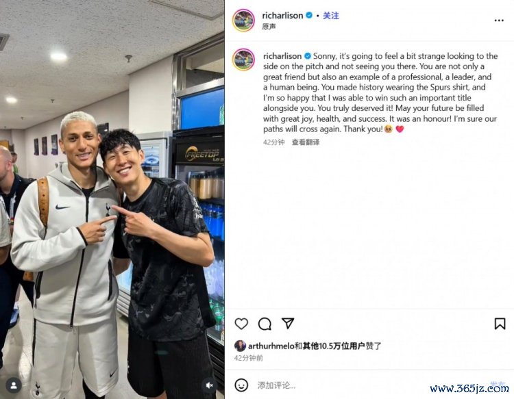 8月4日讯 今日,热刺前场球员理查利森在个人Ins中告别了队友孙兴慜。