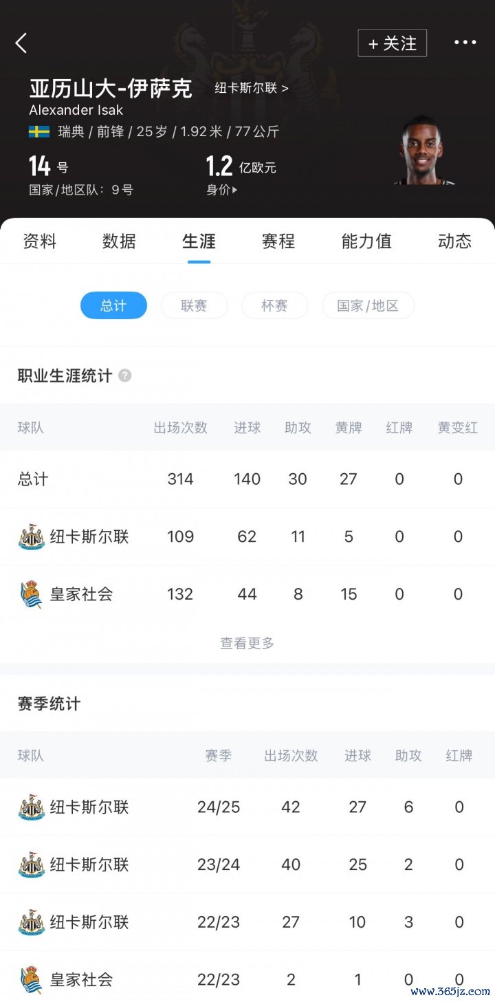 伊萨克现年25岁,德回转 价1.2亿欧,2022年夏天以7000万欧转会费加盟纽卡,至今效力3年,一共出场109次,贡献62球11助功 。伊萨克与纽卡的合同还剩3年。