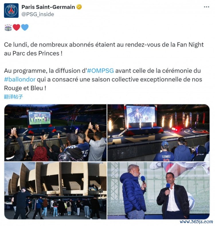 众多巴黎圣日耳曼季票持有者来到王子公园运动活动 场 , 中超英超直播参加球迷之夜活动, 国际米兰观看巴黎圣日耳曼客场应战 对阵马赛的赛事 、金球奖颁奖典礼直播。