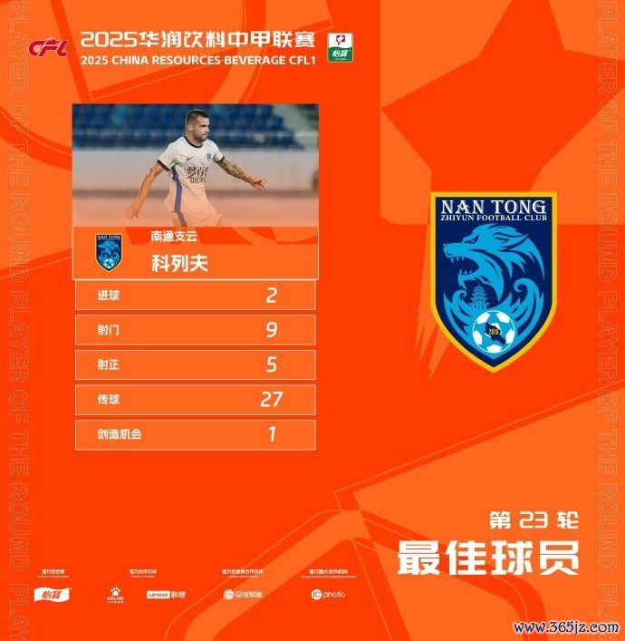 9月23日讯 中甲职业联赛 第23轮最佳球员公布,南通支云的外援科列夫当选。