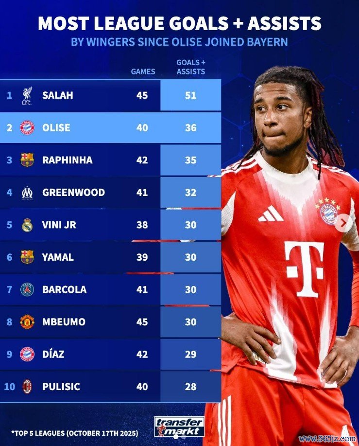 自奥利塞加盟拜仁职业联赛 直接加入 36球,翼锋位置同期仅次于萨拉赫