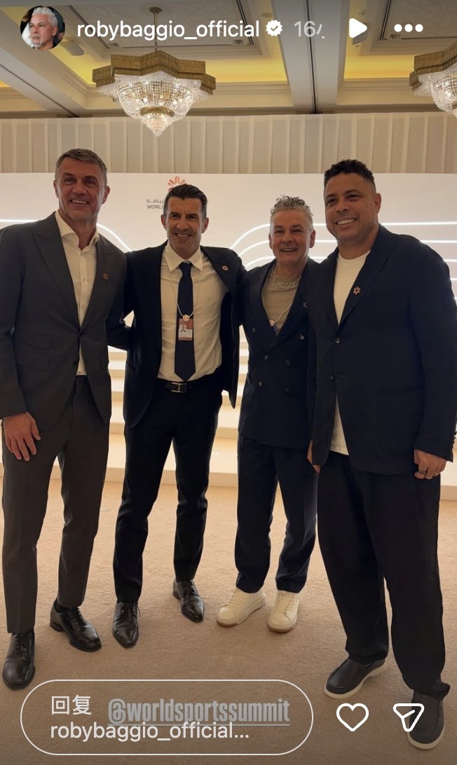 12月30日讯 意大利传奇巴乔在迪拜参加2025世界体育峰会,他在社交媒体晒出了与众多足坛传奇的合照。