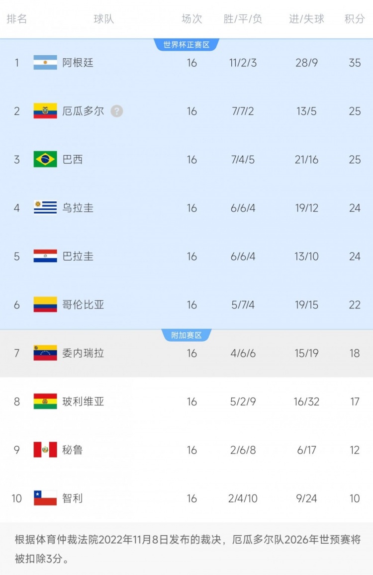 世预赛南美区积分榜