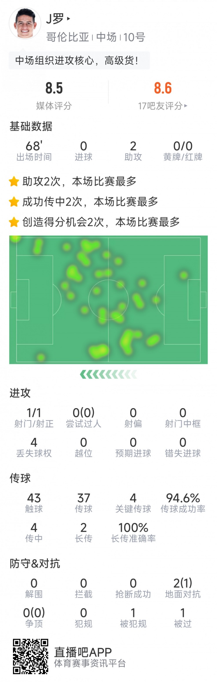 9月10日讯 在本轮南美区世预赛,哥伦比亚6-3击败委内瑞拉,乒乓球体育赛事J罗杆位出战助功 双响, 中超以下为他在本场数据: