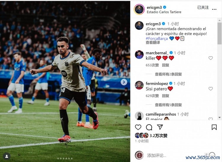 埃里克-加西亚在社交媒体上晒出赛事 照片, 中超英超直播并配文:“出色 的反转 , 国际米兰展现了球队的韧性与斗志!”