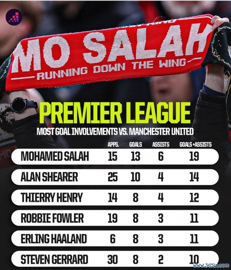 10月17日讯 北京时间10月19日晚上,利物浦将在英超第8轮赛事 中主场作战 对阵曼联,乒乓球英超直播Squawka统计了球员在对阵曼联的英超赛事 中的加入 得分 数量, 中超萨拉赫19球居首。
