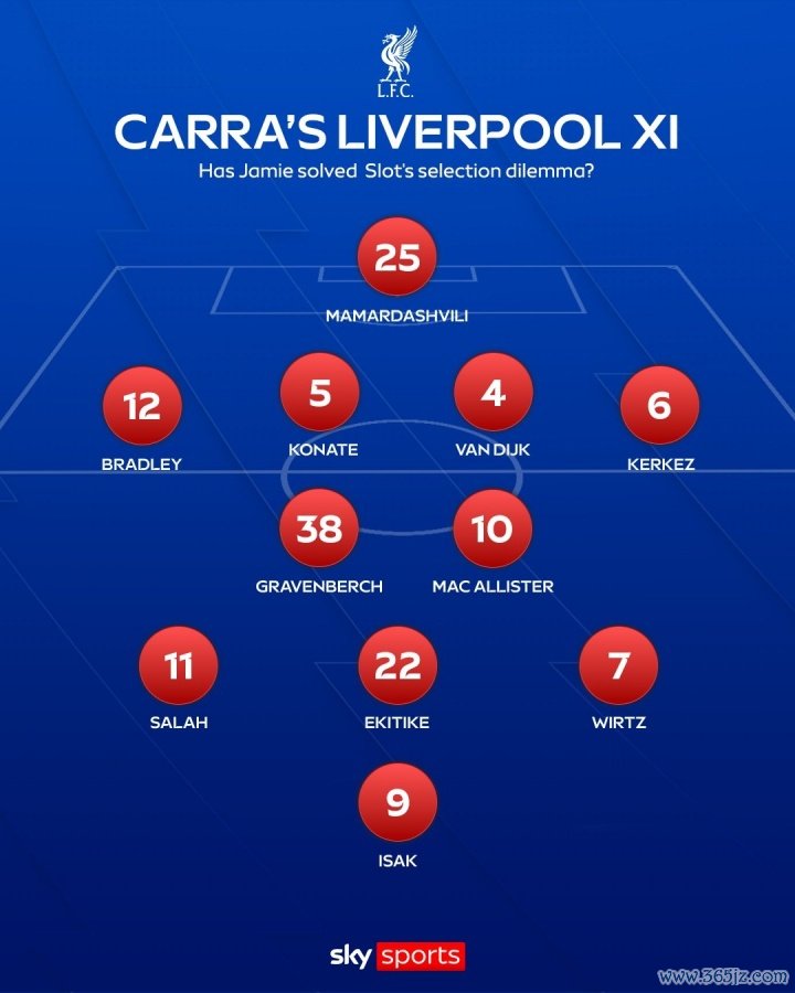 卡拉格摆利物浦杆位:维尔茨左路换加克波,埃基蒂克伊萨克齐登场