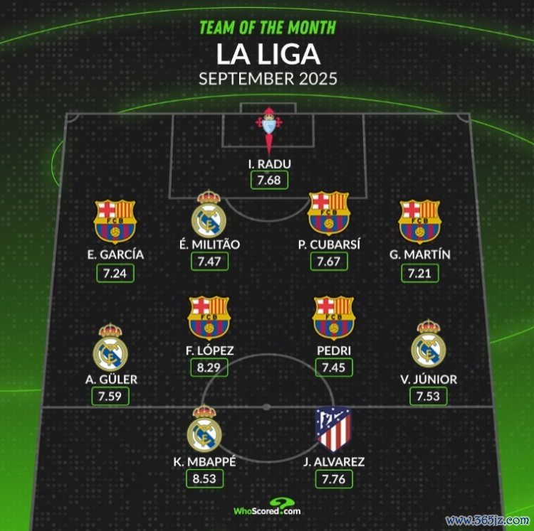 WhoScored西甲9月最佳阵:阿尔瓦雷斯搭档姆巴佩,巴萨5人皇马4人