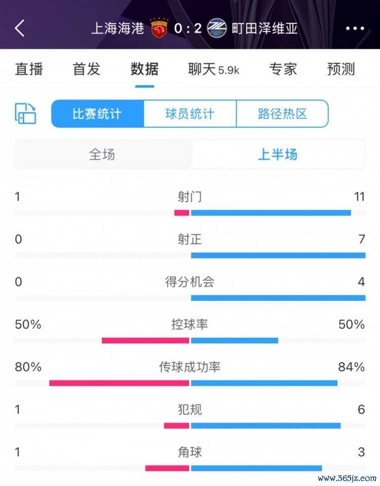 10月21日讯 亚冠精英联赛东亚区第3轮比赛,海港主场迎战町田泽维亚。上半场, 中超体育赛事海港暂时0-2落后。半场数据方面, 国际米兰海港也处于全面下风。